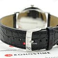 Часы отличаются высоким швейцарским качеством, они оснащены кварцевым механизмом ETA 902.101. Чёрный ремешок из натуральной кожи с тиснением под кожу крокодила отлично гармонирует с белым циферблатом. Корпус из хирургической стали 316L с антикоррозионными свойствами. Стекло из сапфира препятствует появлению царапин на поверхности. Водонепроницаемость при давлении 3 бар. Габариты: 38 x 38 x 6,5 мм.