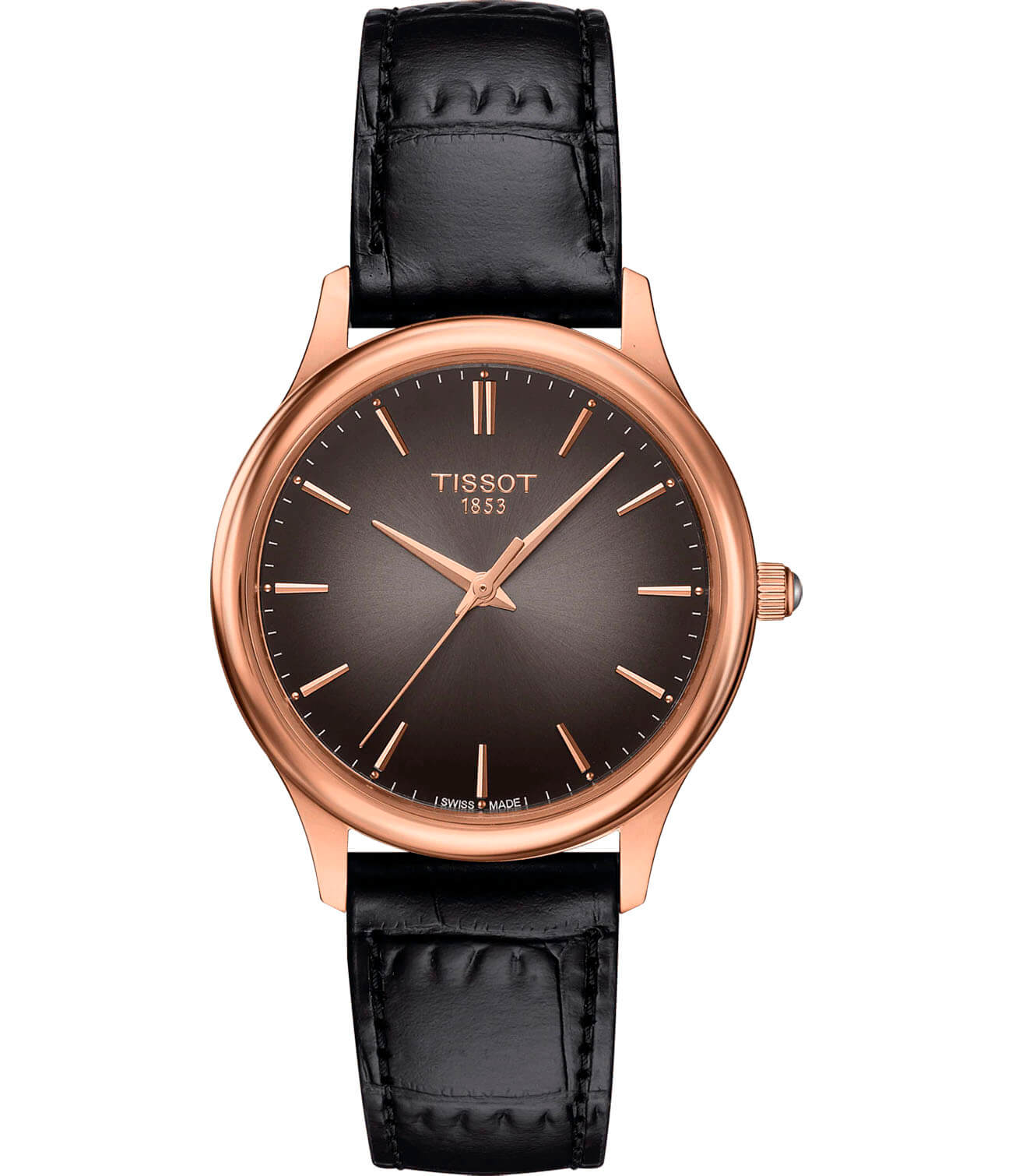 Модель в классическом исполнении точно должна быть в коллекции истинной леди. Дополнительное очарование придаёт сочетание минималистичного антрацитового циферблата и чёрного ремешка из натуральной кожи, поверхность которого сделана под кожу крокодила. Корпус сделан из 18-каратного розового золота18-каратное золотоОбозначение по каратной системе пробирования, оно показывает, сколько драгоценного металла содержится в изделии. 18 карат - в составе 75% чистого золота, соответствует 750 пробе.