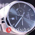 Серебристая модель имеет сдержанный чёрный циферблат, на стрелки нанесено люминесцентное покрытиеЛюминесцентное покрытиеПозволяет считывать показания времени в темноте. Производители наносят на стрелки, часовые индексы, безель или поверхность циферблата светонакопительный состав, дающий холодное свечение., позволяющее узнавать время в темноте. Около метки 9 часов расположен миниатюрный счётчик GMTGMTОтображение времени второго часового пояса.Такая функция особенно актуальна для путешественников и бизнесменов,которые общаются с людьми из разных стран,теперь вы всегда будете знать,какой час у вашего партнёра или близкого человека.. Высокоточный механизм ETA F06.811. Сапфировое стекло отличается повышенной устойчивостью к образованию царапин. Водостойкость 100 метров. Отображение числа. Габариты: 39 x 39 x 10,1 мм.