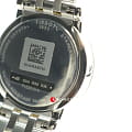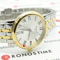Двухцветная модель выполнена в классическом стиле, тонкий стальной браслет стал идеальным вариантом для компактного белого циферблата. Оригинально смотрятся чёрные удлинённые стрелки. Часы оснащены кварцевым механизмом ETA F03.115, позволяющим измерять время с особой точностью. Прочное стекло из сапфира. Водонепроницаемость 50 метров. PVD-покрытиеPVDУльтратонкое покрытие наносится в технике вакуумного напыления, сочетает в себе нитрид титана особой прочности со слоем золота или оксида хрома. Несёт в себе декоративную или защитную функцию.. Отображение даты, индикатор EOLEOLПредставляет собой систему, уведомляющую владельца часов о необходимости замены элемента питания. За 2 недели до полного разряда батарейки секундная стрелка перестаёт ходить чётко и начинает перепрыгивать на 3-4 деления.. Габариты: 30 x 30 x 6,7 мм.