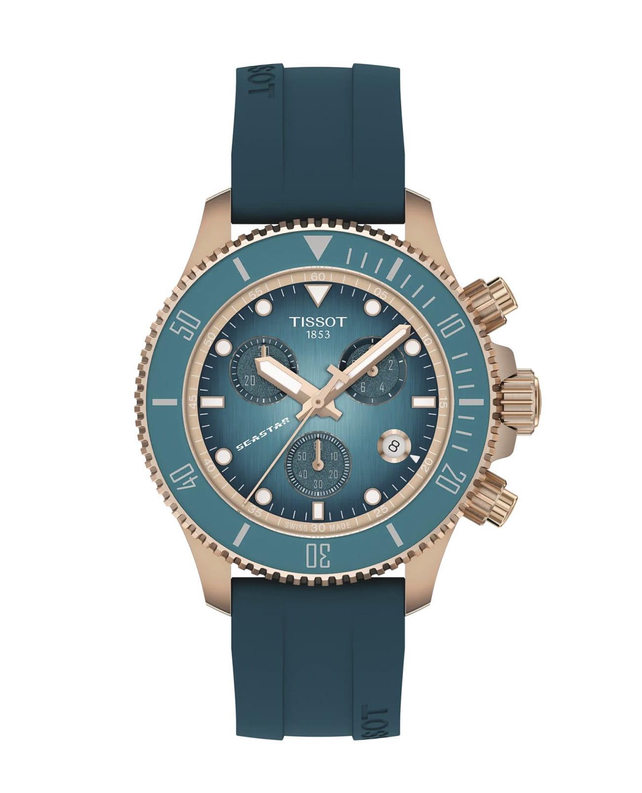 Мужские кварцевые часы Tissot Seastar 38 мм T1202173704100 — это современная интерпретация классического дайвинг-хронографа, сочетающая в себе мощь наследия и передовые технологии. Модель выполнена в круглой форме из нержавеющей стали 316L с PVD-покрытиемPVDУльтратонкое покрытие наносится в технике вакуумного напыления, сочетает в себе нитрид титана особой прочности со слоем золота или оксида хрома. Несёт в себе декоративную или защитную функцию. цвета каштанового золота, что придаёт ей благородный внешний вид и устойчивость к царапинам. Циферблат градиентного бирюзового цвета дополнен индексами, а его поверхность защищена сапфировым стекломСапфировое стеклоПрочный и надёжный материал из кристалла сапфира синтетического происхождения, характеризующийся особой твёрдостью и устойчивостью к царапинам и повреждениям. с двусторонним антибликовым покрытиемАнтибликовое покрытиеСлой оксида металла в 0,13-0,3 микрон, благодаря которому стекло часов не бликует и не отражает свет. Антибликовое покрытие уменьшает отражение света в 10 раз, обеспечивая отличную читаемость показателей циферблата., устойчивым к повреждениям. Стрелки и метки имеют люминесцентное покрытиеЛюминесцентное покрытиеПозволяет считывать показания времени в темноте. Производители наносят на стрелки, часовые индексы, безель или поверхность циферблата светонакопительный состав, дающий холодное свечение. Super-LumiNova®, обеспечивающее отличную читаемость даже в условиях слабого освещения. Браслет из силикона шириной 20 мм оснащён стандартной застёжкой, обеспечивающей комфорт и надёжную фиксацию на запястье. Ремешок является быстросменным, что позволяет легко менять его по желанию. Функциональность модели включает хронограф с центральной секундной стрелкой, 30-минутным и 1/10 секунды счётчиками, функции ADD и SPLIT, а также отображение времени, минут, малой секунды и даты. Водонепроницаемость позволяет использовать модель при плавании, нырянии и других водных активностях без глубокого погружения. Эти часы станут универсальным аксессуаром для тех, кто ценит сочетание стиля, функциональности и швейцарского мастерства — идеальный выбор для повседневной носки и активного образа жизни.