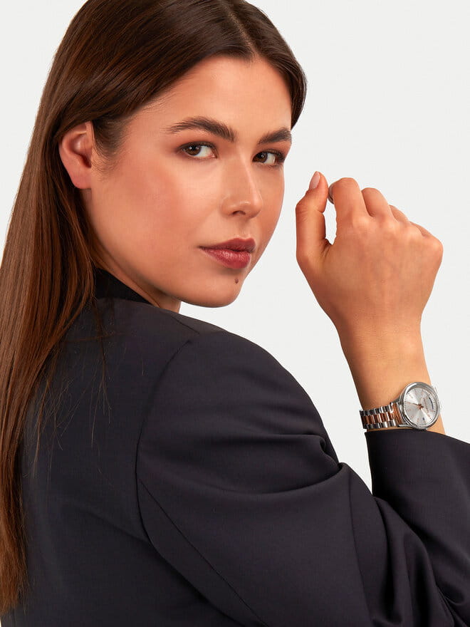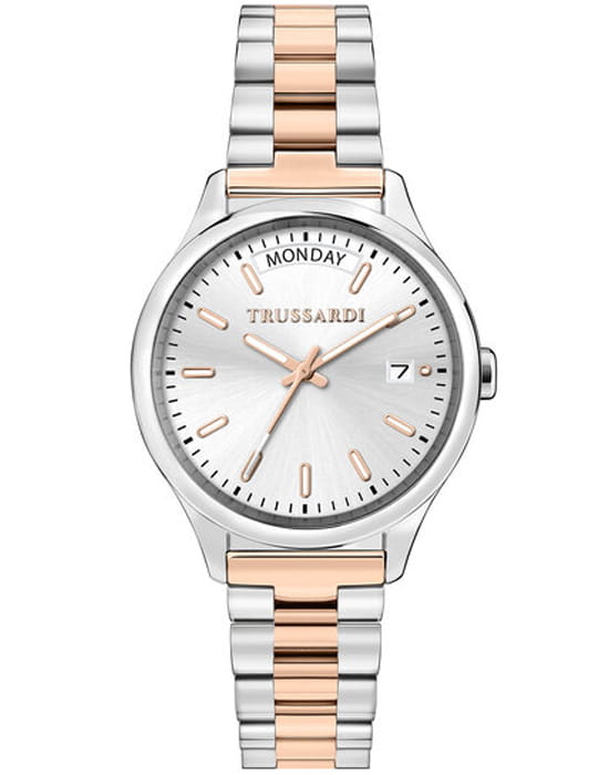 Итальянские женские часы Trussardi T-Vision R2453170501 - это стильный женский аксессуар, который сочетает элегантный дизайн и практичность. Корпус выполнен из нержавеющей стали, что обеспечивает долговечность и утончённый внешний вид. Надежное минеральное стеклоМинеральное стеклоМинеральное стекло представляет собой искусственно выращенный минерал кварца. Такое стекло отличается особой устойчивостью к повреждениям и царапинам. Уступает по некоторым качествам сапфировому стеклу. защищает циферблат от царапин и обеспечивает долговечность. Модель оснащена кварцевым механизмом, обеспечивающим высокую точность хода. Окошко даты в положении 3 часов. Окошко дня недели находится в положении 12 часов. Браслет из нержавеющей стали с частичным IP-покрытиемIP-покрытиеМетод ионного напыления. Демонстрирует повышенную устойчивость к истиранию, окислению и химическим веществам. Под воздействием высокого давления и температуры около 1500°C молекулы металла надёжно соединяются с частицами корпуса часов. с раскладной застёжкойРаскладная застёжкаТакой тип застёжки используется только на браслетах из металла. Она никогда не раскрывается полностью, происходит разделение на 2 и более частей. Раскладывающая застёжка снизит вероятность потери часов к минимуму. обеспечивает комфортное ношение. Стрелки и метки оснащены люминесцентным покрытиемЛюминесцентное покрытиеПозволяет считывать показания времени в темноте. Производители наносят на стрелки, часовые индексы, безель или поверхность циферблата светонакопительный состав, дающий холодное свечение., обеспечивающим отличную видимость даже при слабом освещении. Водозащита 50 метров позволит защитить корпус от случайных брызг или капель дождя. Эта модель – отличный выбор для тех, кто ищет сочетание стиля, качества и функциональности. Часы станут не только полезным аксессуаром, но и выразительным элементом вашего имиджа.