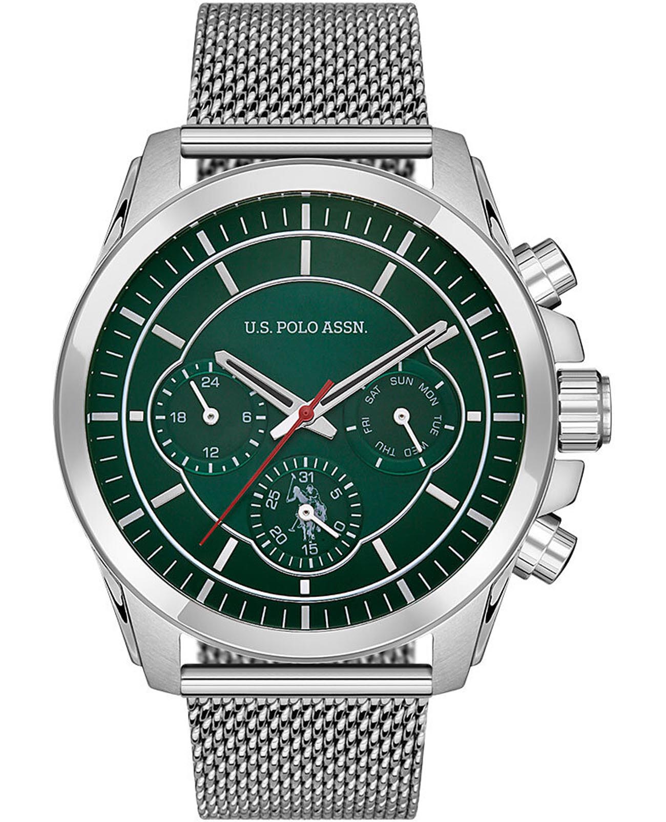 Мужские часы U.S. Polo Assn. Crossing USPA1028-08, кварцевый механизм с высокой точностью. Минеральное стеклоМинеральное стеклоМинеральное стекло представляет собой искусственно выращенный минерал кварца. Такое стекло отличается особой устойчивостью к повреждениям и царапинам. Уступает по некоторым качествам сапфировому стеклу. устойчивое к появлению царапин, обладающее высокой прозрачностью. Корпус изготовлен из нержавеющей стали. На циферблате три дополнительных индикатора. Центральные часовая, минутная и секундная стрелки. Индикация даты и дня недели. 12/24х часовой формат времени. Стрелки с люминесцентным покрытиемЛюминесцентное покрытиеПозволяет считывать показания времени в темноте. Производители наносят на стрелки, часовые индексы, безель или поверхность циферблата светонакопительный состав, дающий холодное свечение.. Класс водозащиты: 50 метров, позволит защитить корпус от случайных брызг или капель дождя. Стальной браслет миланского плетения на раскладном замкеРаскладной замокДанный вариант застежки используется только на часах с металлическим браслетом. Отличительная особенность такого крепления в том, что длина браслета становится универсальной и вы можете самостоятельно отрегулировать нужный вам размер – застежка просто двигается по браслету часов..