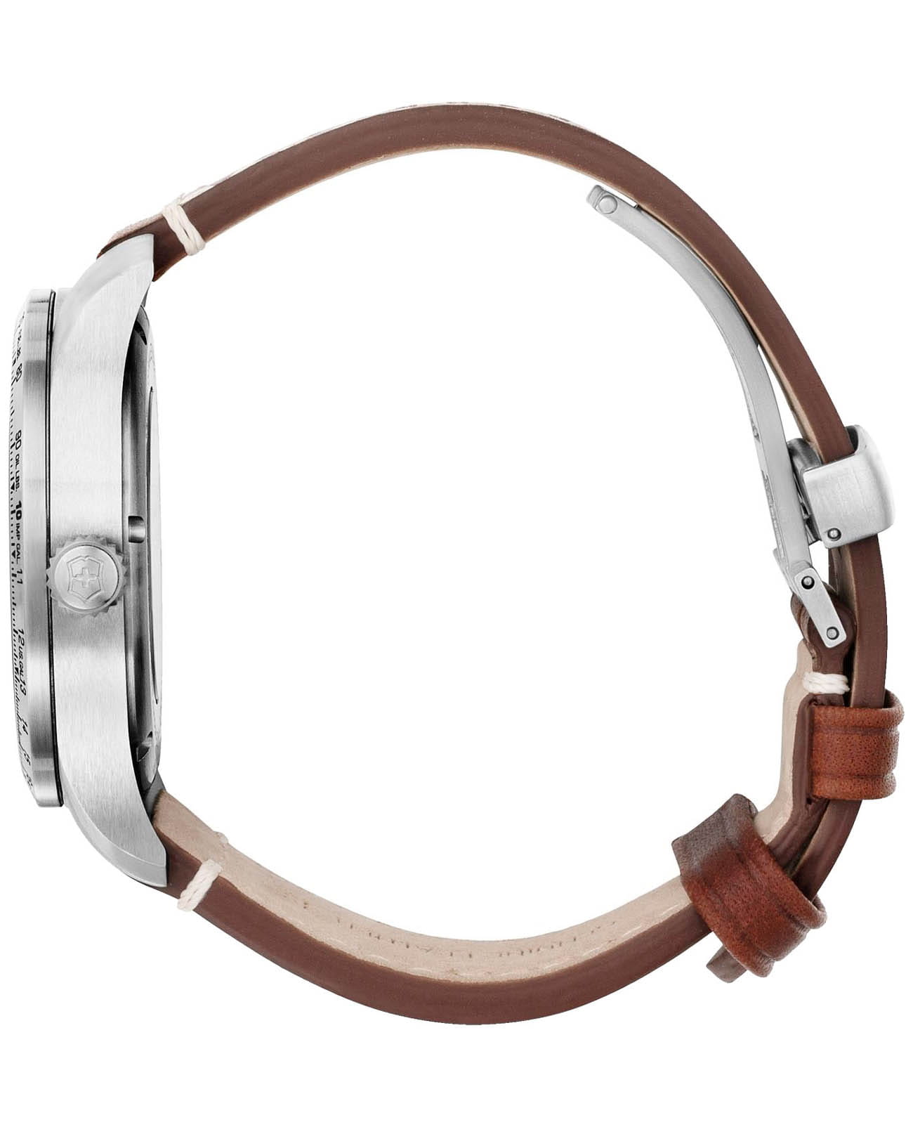 Мужские механические часы Victorinox AirBoss 241887. Корпус часов изготовлен из нержавеющей стали. Сапфировое стеклоСапфировое стеклоПрочный и надёжный материал из кристалла сапфира синтетического происхождения, характеризующийся особой твёрдостью и устойчивостью к царапинам и повреждениям. с тройным антибликовым покрытием. Практичный кожаный ремешок с раскладной застёжкойРаскладная застёжкаТакой тип застёжки используется только на браслетах из металла. Она никогда не раскрывается полностью, происходит разделение на 2 и более частей. Раскладывающая застёжка снизит вероятность потери часов к минимуму.. Стрелки и метки с люминесцентным покрытиемЛюминесцентное покрытиеПозволяет считывать показания времени в темноте. Производители наносят на стрелки, часовые индексы, безель или поверхность циферблата светонакопительный состав, дающий холодное свечение.. БезельБезельВнешний ободок, закрепляющий стекло. В спортивных часах так называется поворотное кольцо с делениями на циферблате, выполняет роль таймера – замеряет отрезки времени на шкале. Неподвижный безель – элемент декора. Однонаправленно вращающийся безель на дайверских часах позволяет фиксировать моменты погружения и выныривания на поверхность. с логарифмической линейкой. Эта функция позволяет измерять такие метрические параметры, как объем, скорость, расстояние и расход топлива, и конвертировать различные переменные. Окошко даты находится в положении 6 часов.