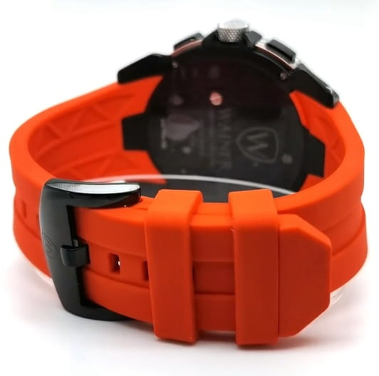 Швейцарские мужские кварцевые часы-хронограф Wainer Trio WA.16910-K с механизмом калибра Ronda 5030 созданы для любителей современного спортивного стиля. Часы оснащены широким набором функций, включая секундомер, тахиметр и вынесенную секундную стрелку. Круглый корпус из нержавеющей стали 316L с частичным PVD-покрытиемPVDУльтратонкое покрытие наносится в технике вакуумного напыления, сочетает в себе нитрид титана особой прочности со слоем золота или оксида хрома. Несёт в себе декоративную или защитную функцию. диаметром 47 мм и толщиной 13 мм защищен прочным сапфировым стекломСапфировое стеклоПрочный и надёжный материал из кристалла сапфира синтетического происхождения, характеризующийся особой твёрдостью и устойчивостью к царапинам и повреждениям.. Черный циферблат с метками в виде штрихов оснащен окошком даты в положении 6 часов. Стрелки с люминесцентным покрытиемЛюминесцентное покрытиеПозволяет считывать показания времени в темноте. Производители наносят на стрелки, часовые индексы, безель или поверхность циферблата светонакопительный состав, дающий холодное свечение. обеспечивают хорошую видимость в темное время суток. Рифленая заводная головка с защитой добавляет надежности модели. Часы имеют класс водозащиты 100 метров, позволит плавать, нырять и заниматься другими водными видами спорта. Модель комплектуется удобным силиконовым ремешком шириной 24 мм на стандартной застежке. Вес часов составляет 140 грамм, что обеспечивает комфортное ношение в течение дня.