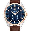 Швейцарские мужские кварцевые часы Wainer WA.17100-B с круглым корпусом из нержавеющей стали 316L с частичным PVD-покрытиемPVDУльтратонкое покрытие наносится в технике вакуумного напыления, сочетает в себе нитрид титана особой прочности со слоем золота или оксида хрома. Несёт в себе декоративную или защитную функцию. диаметром 46 мм и толщиной 11.5 мм станут идеальным аксессуаром на каждый день. Синий циферблат, выполненный по технологии Sunray (солнечные лучи), защищен устойчивым к царапинам минеральным стекломМинеральное стеклоМинеральное стекло представляет собой искусственно выращенный минерал кварца. Такое стекло отличается особой устойчивостью к повреждениям и царапинам. Уступает по некоторым качествам сапфировому стеклу. с сапфировым покрытием и украшен фирменным логотипом Wainer в положении 12 часов. Метки в виде штрихов и вынесенная секундная стрелка на отдельном циферблате обеспечивают удобство считывания времени. Окошко даты расположено в положении 12 часов. Рифленая заводная головка добавляет практичности модели. Часы имеют класс водозащиты 50 метров, позволит защитить корпус от случайных брызг или капель дождя. Модель комплектуется кожаным ремешком шириной 22-20 мм, что обеспечивает комфортное ношение благодаря весу всего 79 грамм. Элегантный дизайн и надежное качество швейцарского производства делают эти часы превосходным выбором для современного мужчины.