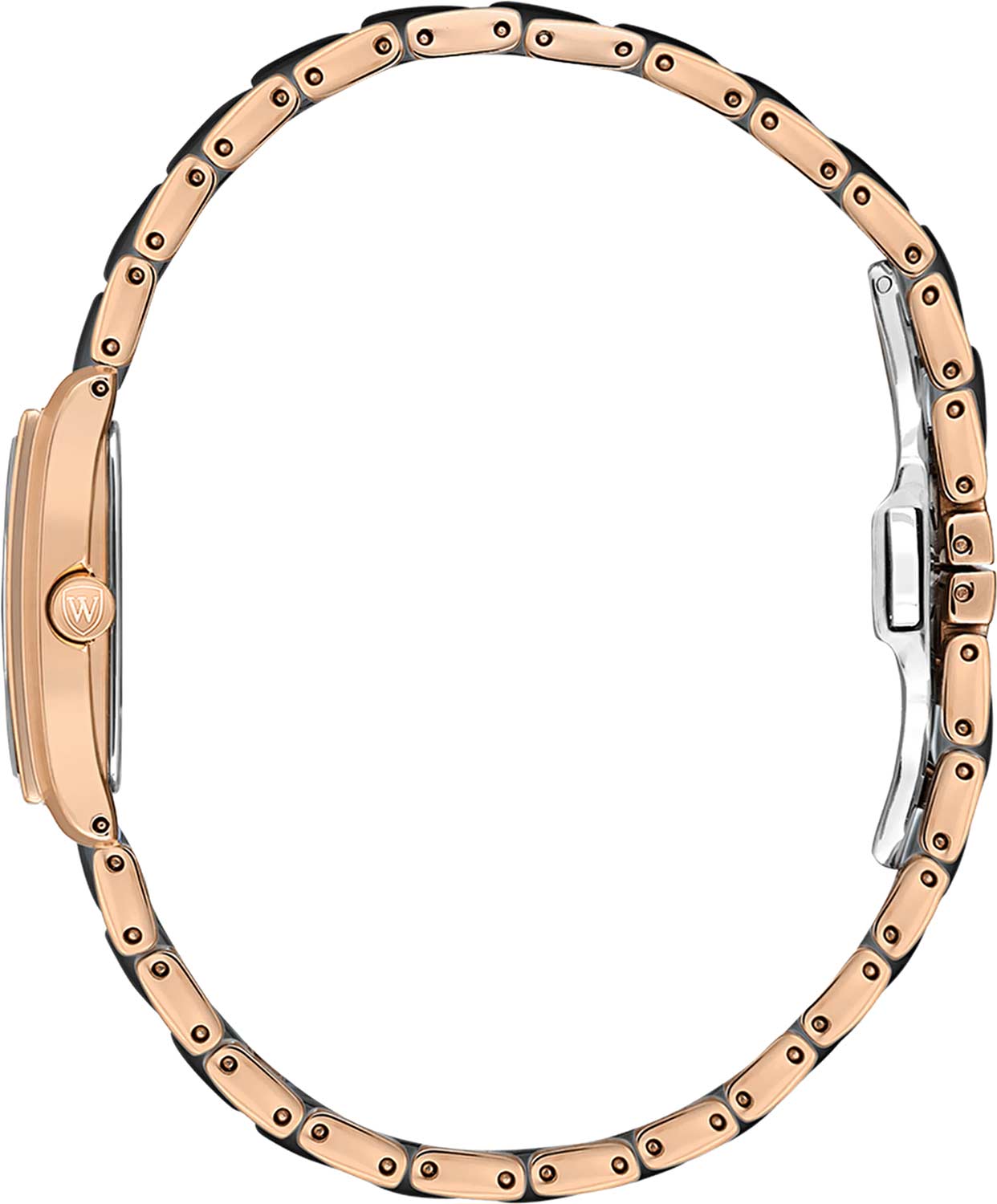 Швейцарские женские кварцевые часы Wainer WA.18060-E станут элегантным дополнением любого образа. Прямоугольный корпус из нержавеющей стали 316L размером 22х24.5 мм и толщиной 8 мм защищен прочным сапфировым стекломСапфировое стеклоПрочный и надёжный материал из кристалла сапфира синтетического происхождения, характеризующийся особой твёрдостью и устойчивостью к царапинам и повреждениям.. Циферблат с метками в виде штрихов украшен кристаллом в положении 12 часов, а заводная головка с фирменным логотипом добавляет модели особый шарм. Часы имеют класс водозащиты 30 метров, позволит защитить корпус от случайных брызг или капель дождя. Модель комплектуется стальным браслетом из нержавеющей стали 316L с керамическими вставками на раскладной застёжкеРаскладная застёжкаТакой тип застёжки используется только на браслетах из металла. Она никогда не раскрывается полностью, происходит разделение на 2 и более частей. Раскладывающая застёжка снизит вероятность потери часов к минимуму., длина браслета составляет 180 мм. Вес часов 88 грамм обеспечивает комфортное ношение в течение дня. Элегантный дизайн и надежное качество швейцарского производства делают эти часы превосходным выбором для современной женщины.