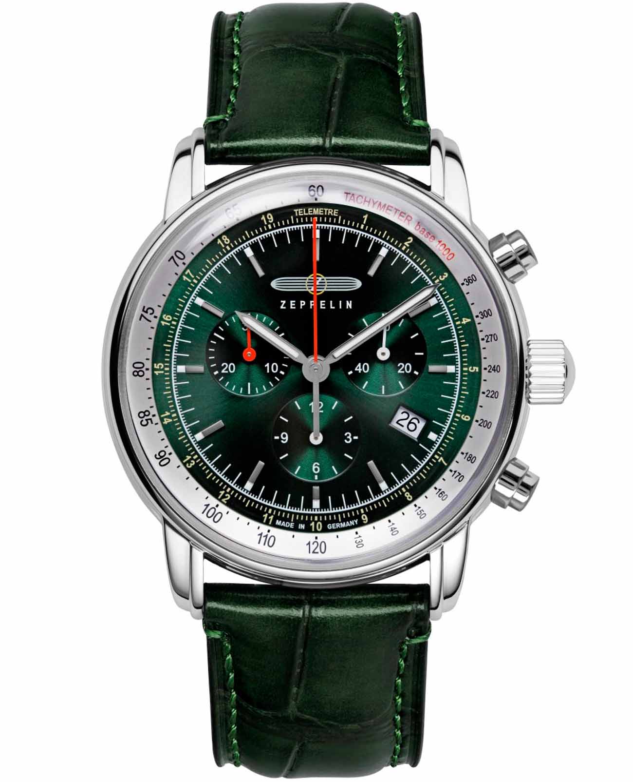 Мужские наручные часы-хронографХронографФункция позволяет измерять отрезки времени с особой точностью: часы, минуты, секунды. Верным признаком хронографа является наличие на циферблате 3 дополнительных окошек-счётчиков. Zeppelin 88884 из коллекции LZ14 Marine сочетают в себе классический дизайн и надежность современных технологий. Модель обладает круглым корпусом диаметром 42 мм, изготовленным из нержавеющей стали, что обеспечивает высокую устойчивость к внешним воздействиям. Браслет выполнен из натуральной кожи, гарантирующей комфортное ношение. Зеленый циферблат с серебристыми светящимися индексами и люминесцентными стрелками оснащен окном даты на «4 часах». Для защиты используется минеральное стеклоМинеральное стеклоМинеральное стекло представляет собой искусственно выращенный минерал кварца. Такое стекло отличается особой устойчивостью к повреждениям и царапинам. Уступает по некоторым качествам сапфировому стеклу., обеспечивающее прочную защиту от царапин. Часы работают на кварцевом механизме Ronda 5030.D швейцарского производства, что гарантирует точное время без необходимости подзаводки. Модель также является хронографом, оснащенным функцией секундомераСекундомерСекундоме́р — прибор, способный измерять интервалы времени с точностью до долей секунды., делая ее идеальной для активного образа жизни. Водонепроницаемость часов достигает 5 атмосфер (50 метров), что позволяет использовать их во время плавания на поверхности, однако не рекомендуется для глубоководного дайвинга или занятий водными видами спорта с высоким уровнем активности.